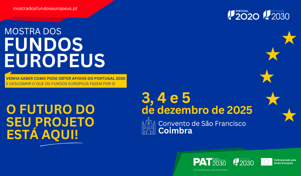 A Mostra dos Fundos Europeus e a Cerimónia de Entrega dos Prémios dos Fundos Europeus vai realizar-se nos dias 3, 4 e 5 de dezembro de 2025, no Convento de São Francisco, em Coimbra.